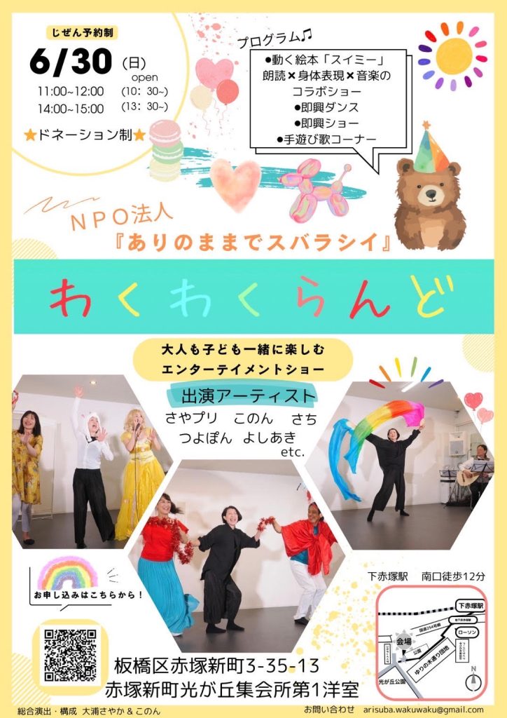 6/30日にインプロ(即興劇)と即興ダンスと「動く絵本」の読み聞かせなど未就学児と保護者向けイベントを開催します。(どなた様も歓迎) / archaive, event, News / By yasu 各界ベテラン勢が集まり️即興劇️即興ダンス️動く絵本の読み聞かせ️手遊び歌遊び、紙芝居️合唱、合奏などお届けします♪東上線下赤塚駅 お近くでしたら是非豪華メンバーでお届けします!このん藤田祥斎藤美明(the CRAZY ANGEL COMPANY)大浦さやか(ハイスピリッツ)金本壮史(ハイスピリッツ)かなピコ(ハイスピリッツ)アヤカしのぶえりちゃんドネーション制